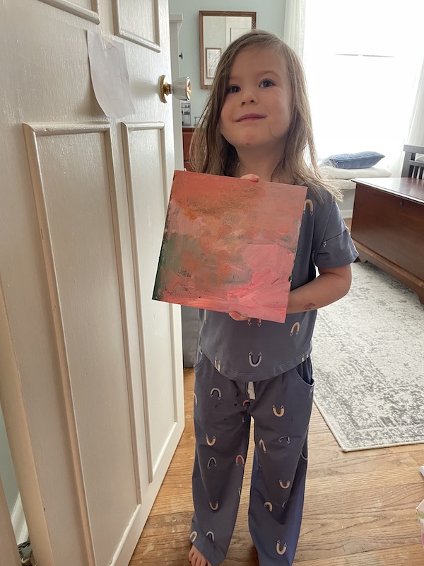 Like their Nana, they also like to create art. I had fun teaching my youngest granddaughter about mixing colors — red and white make pink. Add a little green and you get a slightly darker shade, more makes brown. She also played with applying a big glob of paint with a palette knife. That was fun! So was pressing the end of her paintbrush onto her canvas. She was pretty proud of her work. She just needs to sign it and we’ll put it in a frame. She’s already decided where she wants to hang her beautiful painting.