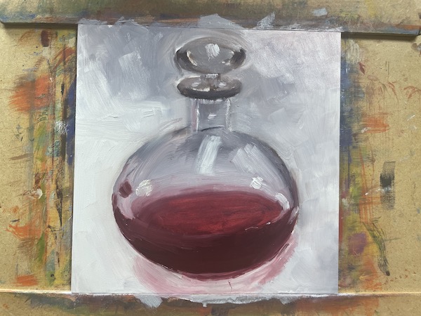 Take this carafe of wine for instance, which was a quick painting. Lots to fix here, BUT I think I did a decent job on the dark curved line just above the neck.